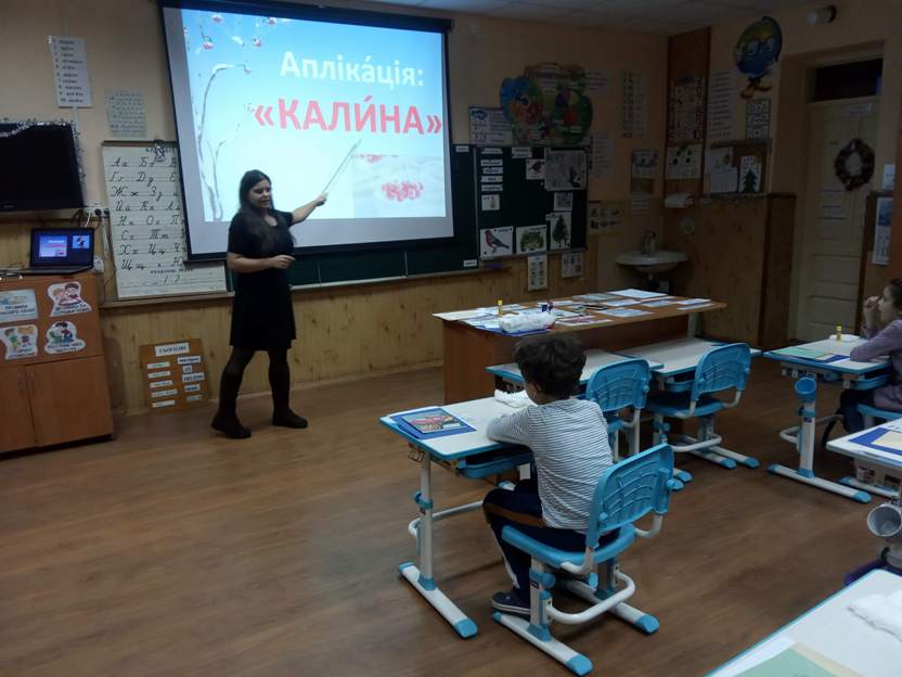 Вихователем Шманьо Мариною Миколаївною було проведено відкрите виховне заняття у 2 класі на тему:Аплікація Калина. Під час заняття використовувався роздатковий матеріал, фотокартки,презентація,відео,зразок аплікації. Заняття подавалось у формі казки про снінурів та калину. Дітки робили аплікацію до поданої казки та вивчали словник до неї. Постійно закріплювали словник з карток та фотокарток.