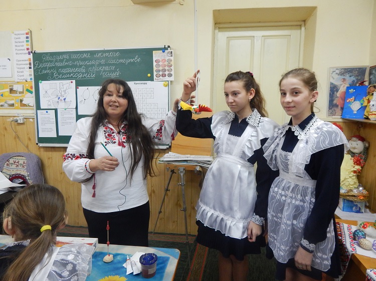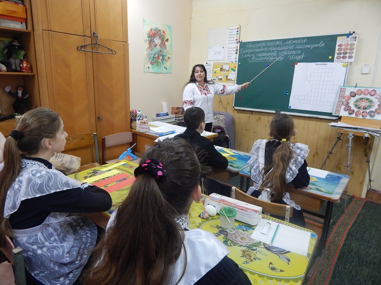 Комбінований урок з образотворчого мистецтва у 6 класі провела Олексюк Тамара Григоріївна. Робота парами дала можливість учням краще засвоїти тему: «Декоративно-прикладне мистецтво. Хатні писанкові прикраси. Великодній голуб». Вихованці продемонстрували досить хороші практичні навички в різних видах художньої діяльності. Виховання естетичного смаку та любові до народних традицій відчувалось протягом усього уроку.