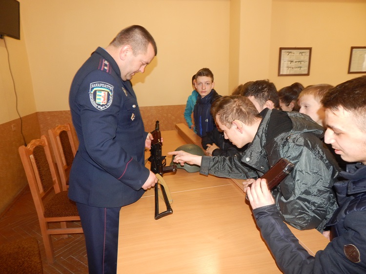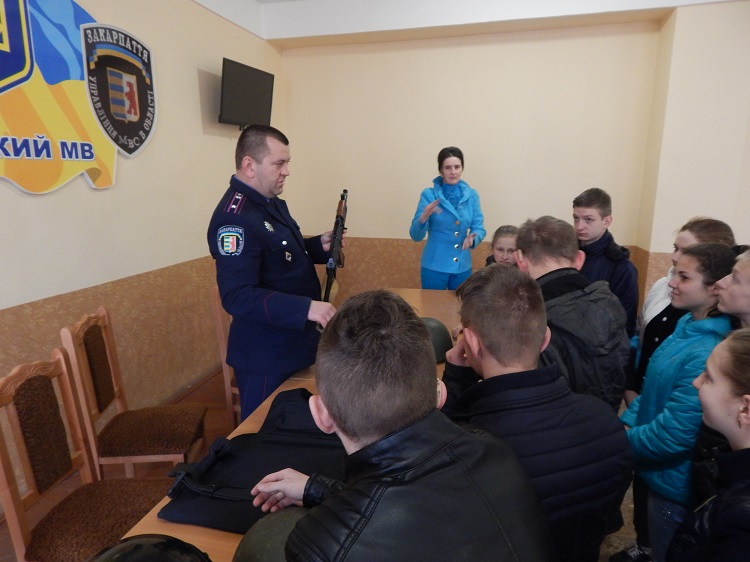 Старші інспектори поліції, майор поліції Юрій Липчей та капітан поліції Олександр Кучерявий провели екскурсію по відділку поліції, де ознайомили учнів зі зброєю та спецзасобами, які працівники поліції використовують під час несення служби. Правоохоронці розповіли про зброю та її особливості, про призначення спецзасобів та засобів індивідуального захисту працівника поліції: гумових кийків, наручників, бронежилетів, касок тощо. Під час навчального уроку діти не тільки бачили своїми очима, але всі ці речі вони мали можливість брати у руки та одягати на себе.