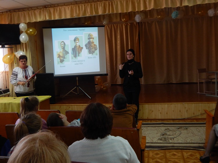 У школі відбулося свято «Від козаків до кіборгів». Воно було присвячене дню захисника, яке провела вчителька Загребельна Вікторія Олександрівна. Учні дізналися про історію свята 14 жовтня, ким і коли було започатковане.