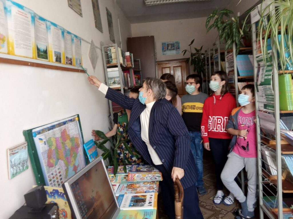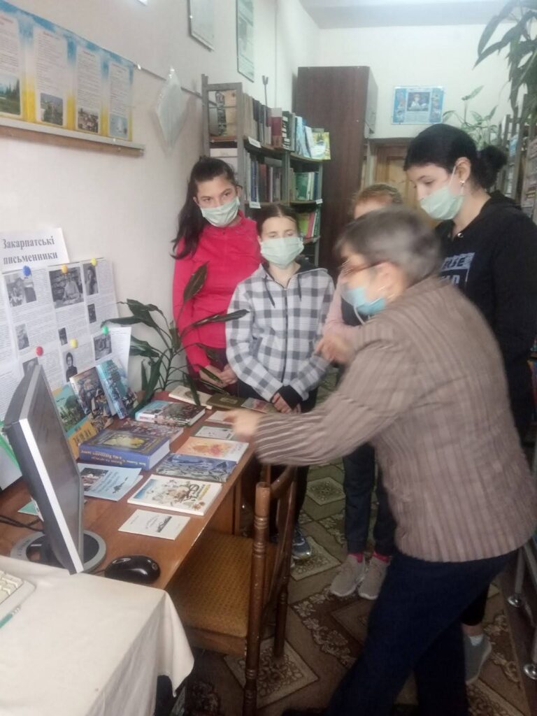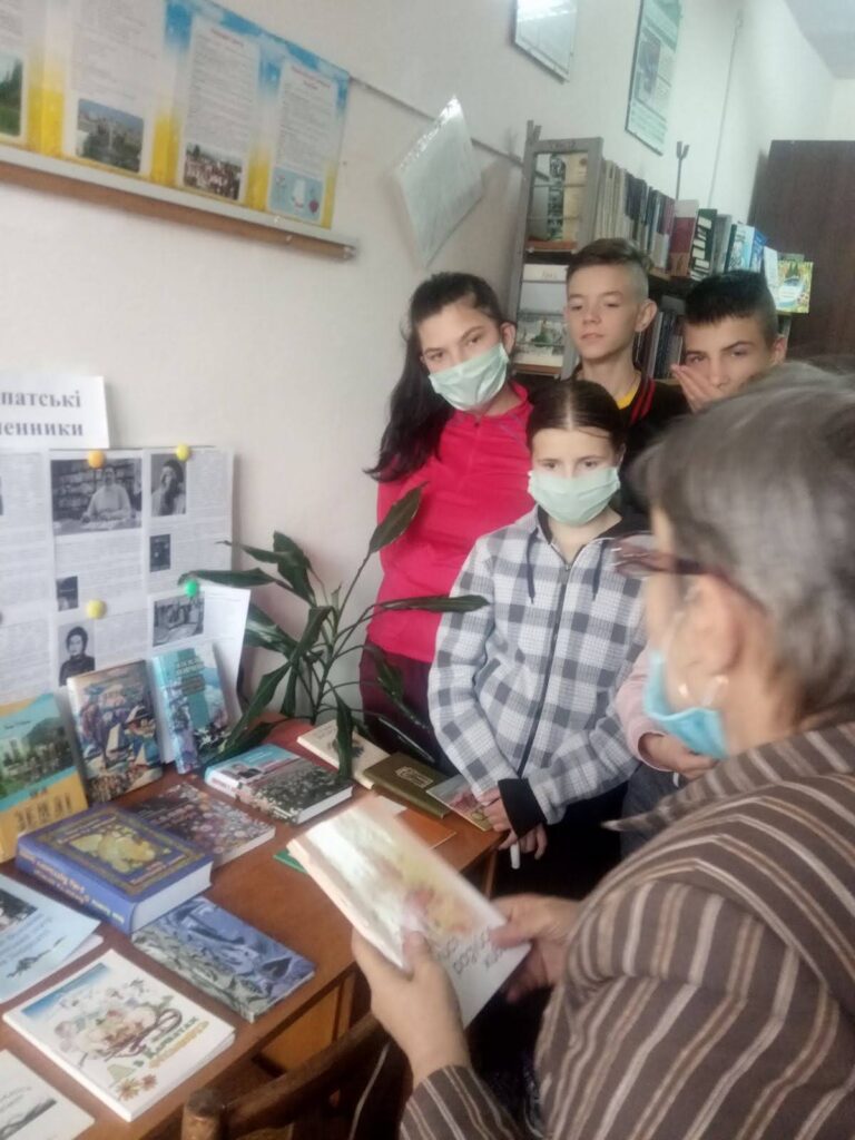 Про літературу Закарпаття бібліотекарка вела мову з дев’ятикласниками . Окремо продемонстровано книги поетів та письменників Хустщини. Учні були приємно вражені, коли Наталія Василівна прочитала вірш Надії Танчинець «Донечці Оксанці», яка зараз працює педагогом-організатором у нашій школі.