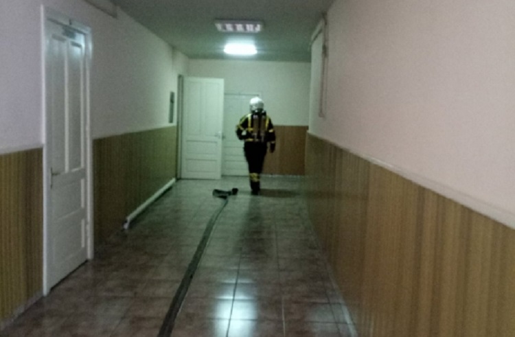Відповідно до сценарію проведення навчань, на території школи у підвальному приміщенні виникла пожежа у кабінеті, це помічає один з працівників школи, який негайно повідомляє про це керівництво закладу освіти та телефонує за номером 101.