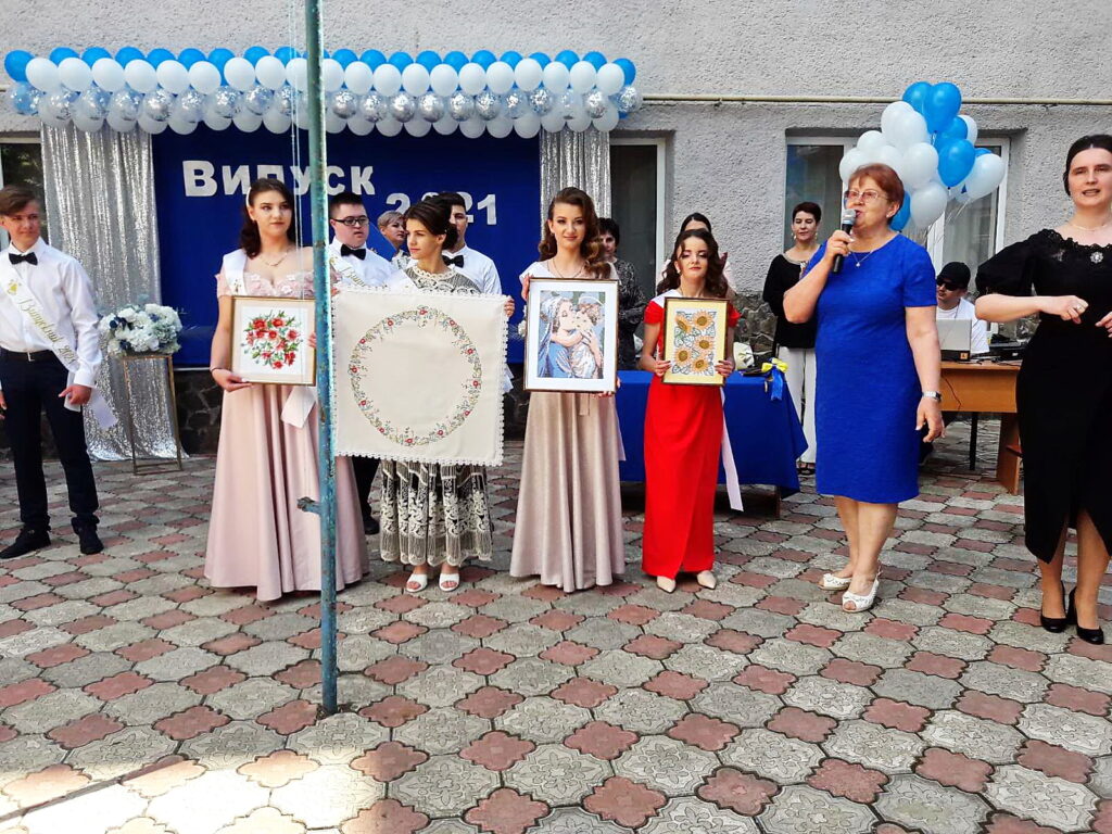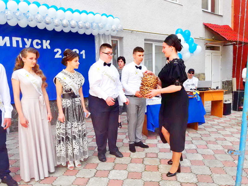 Потім відбувся обмін подарунками. Традиційні хлібниці, виготовлені нашими школярами, як символ достатку,подарували випускникам, а вони, в свою чергу - вишиті картини, скатертини та полички для квітів, зроблені своїми руками - школі. Далі прозвучала пісня у жестовому виконанні найкращої учениці школи Плешинець Євгенії  та чудові композиції ксилофоністів.