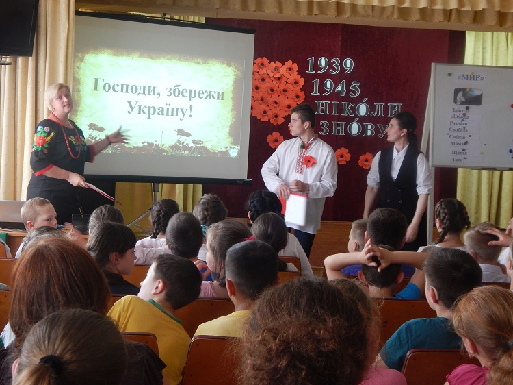 Проводилася робота з прислів’ями, діти складали асоціативні кущі до слів «Війна», «Мир». Учні 9 класу підготували інсценівку «Свічка пам’яті». Всі присутні вшанували полеглих у боях хвилиною мовчання.