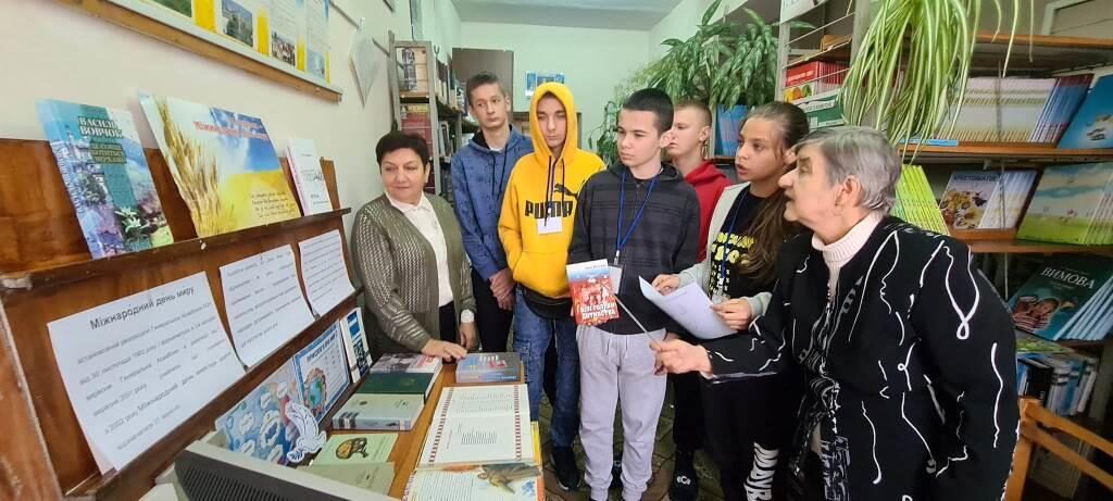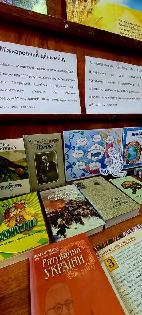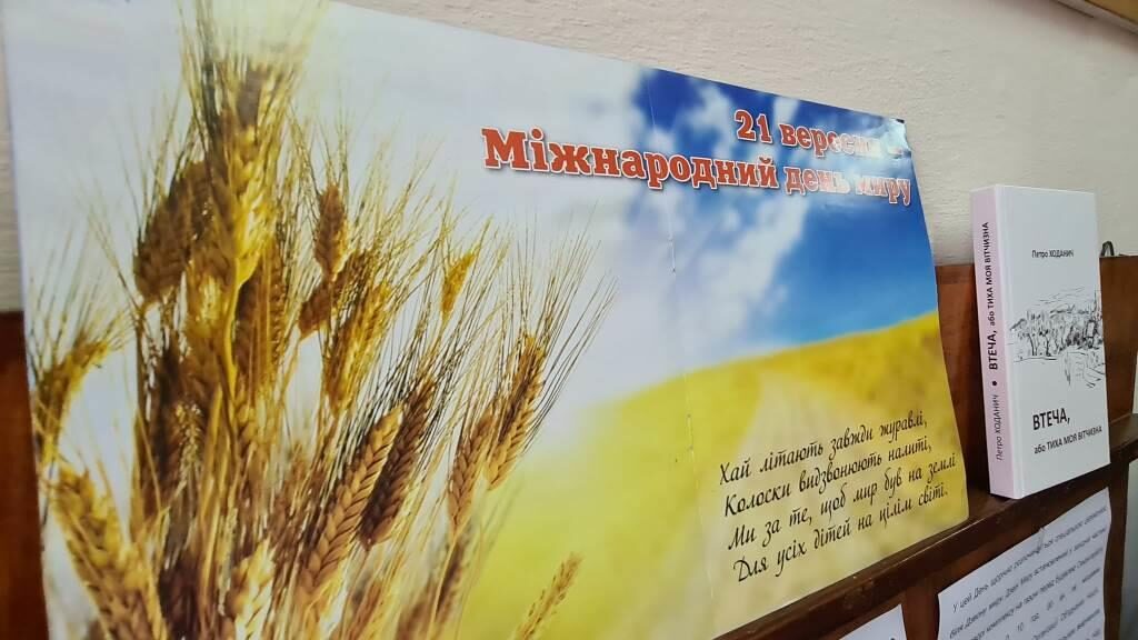 Учні школи знайомляться з ілюстративною виставкою до Міжнародного дня миру, який щорічно відзначається 21 вересня.