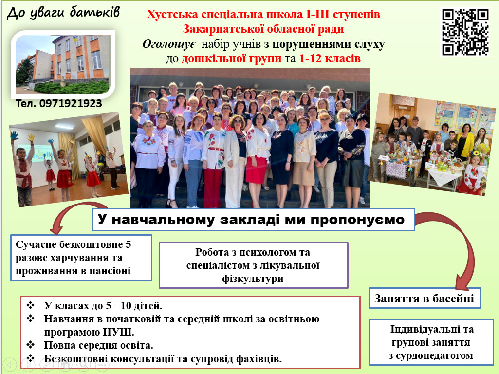Хустська спеціальна школа І-ІІІ ступенів Закарпатської обласної ради оголошує набір дітей з вадами слуху для навчання і виховання з першого по дванадцятий класи віком від 6 років.