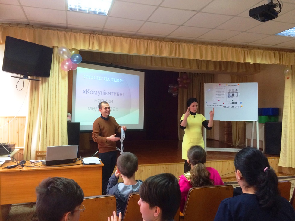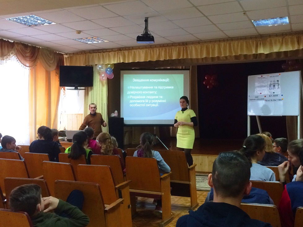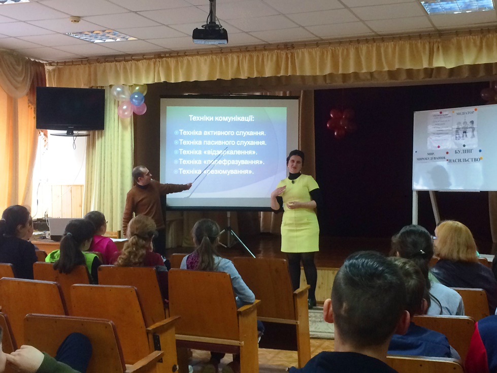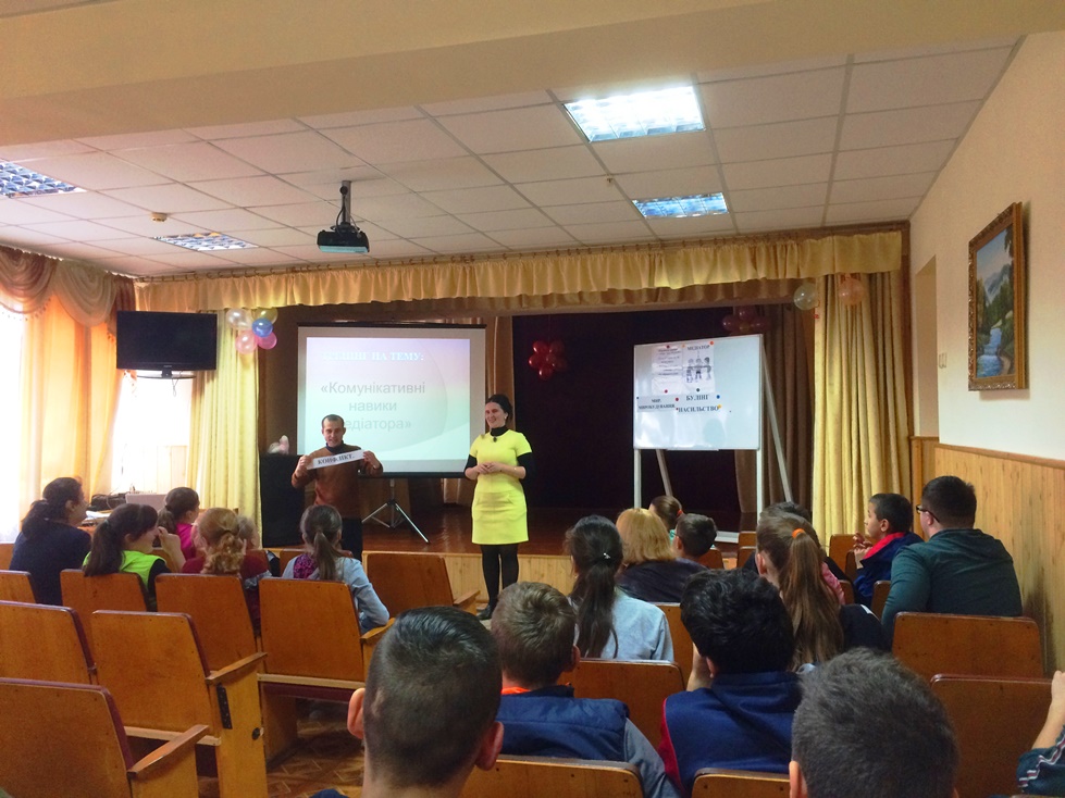 Психологом школи відбувається впровадження програми «Вирішення конфліктів мирним шляхом. Базові навички медіації». Відтак, серед учнів 6 – 10 класу проведено тренінг «Комунікативні навички медіатора» . Відбулось ознайомлення учнів із техніками комунікації, а саме: техніка активного слухання; техніка пасивного слухання; техніка «віддзеркалення»; техніка «перефразування»; техніка «резюмування».