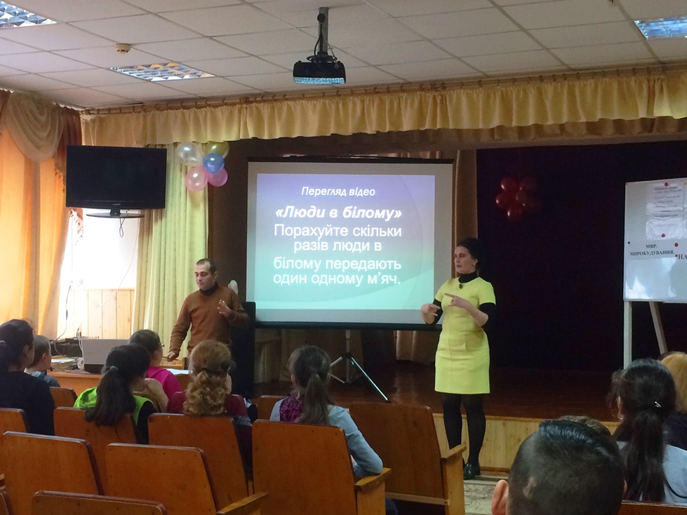 Учасники тренінгу розглянули відео «Люди в білому», метою якого було показати те, що людина вибірково сприймає інформацію. Учні дійшли до спільної думки, що наша увага є вибірковою, зазвичай, ми зосереджуємося на деталях, які цікавлять нас, і помічаємо лише те, на що звертаємо увагу. Другий момент: навіть, якщо ми щось бачимо і чуємо, але в нашій «картині світу» цього немає, то ми це і не помічаємо.