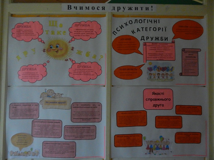 Він розпочався з ознайомлення учнів з мовно-ілюстративним кутком на тему: «Вчимося дружити» - учні мали можливість ознайомитися з цікавою та потрібною інформацією про психологічні категорії поняття дружби, про способи пошуку вірного друга та необхідність виховання в собі позитивних рис задля можливості мати справжнього друга.